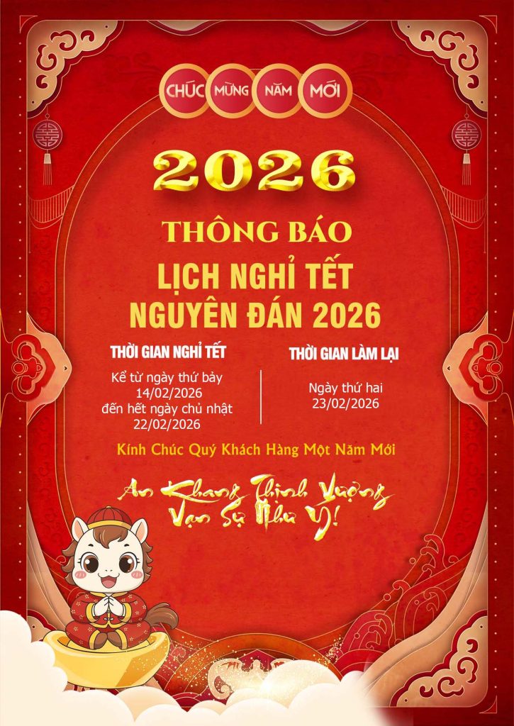 Thời gian nghỉ lễ: từ ngày thứ bảy 14/02/2026 đến hết ngày chủ nhật 22/02/2026.